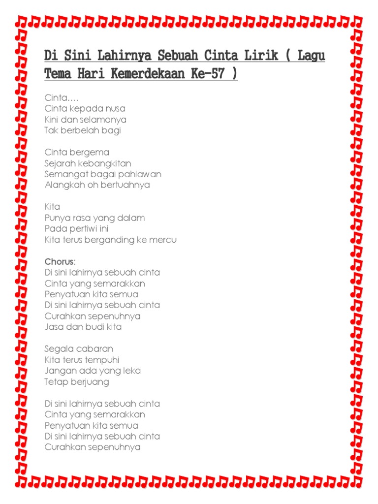 Lirik lagu DI SINI LAHIRNYA SEBUAH CINTA Lagu Tema Hari Kebangsaan Ke-57 Cinta Cinta kepada nusa Kini dan selamanya Tak berbelah bagi. Cuma bagi aku makin besar makin kurang meriah. Tema tahun ini disini lahirnya sebuah cinta.